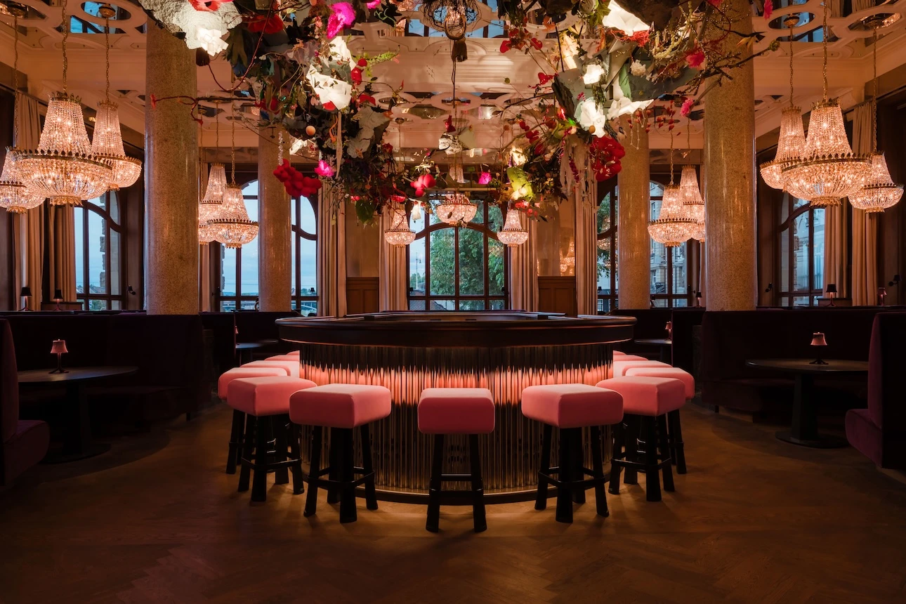 Im ehemaligen Ballsaal erwartet mich eine Überraschung: Auch dieser Raum wurde von den Basler Architekten komplett umgestaltet und hat eine neue Funktion erhalten. Hier ist das Restaurant „Banks“ eingezogen, das europäisch-asiatische Kreationen serviert. Der Name spielt sowohl auf das Flussufer (englisch: „river bank“) als auch auf den nahegelegenen Finanzplatz an. Im Zentrum des Raumes befindet sich eine skulpturale Bar aus Chromstahl, über der eine farbenfrohe Installation von Gerda Steiner & Jörg Lenzlinger schwebt. Sie vereint florale und maritime Formen mit Fundstücken aus dem Hotel zu einer faszinierenden Komposition. Je länger ich hinschaue, desto mehr Details entdecke ich – hier hängt ein Zimmerschlüssel, dort Silberbesteck, dazwischen ragt ein Kleiderbügel heraus. Rundherum spiegeln polierte und geschliffene Metallpaneele an den Wänden die zahlreichen Kronleuchter und auch das Kunstwerk wider.